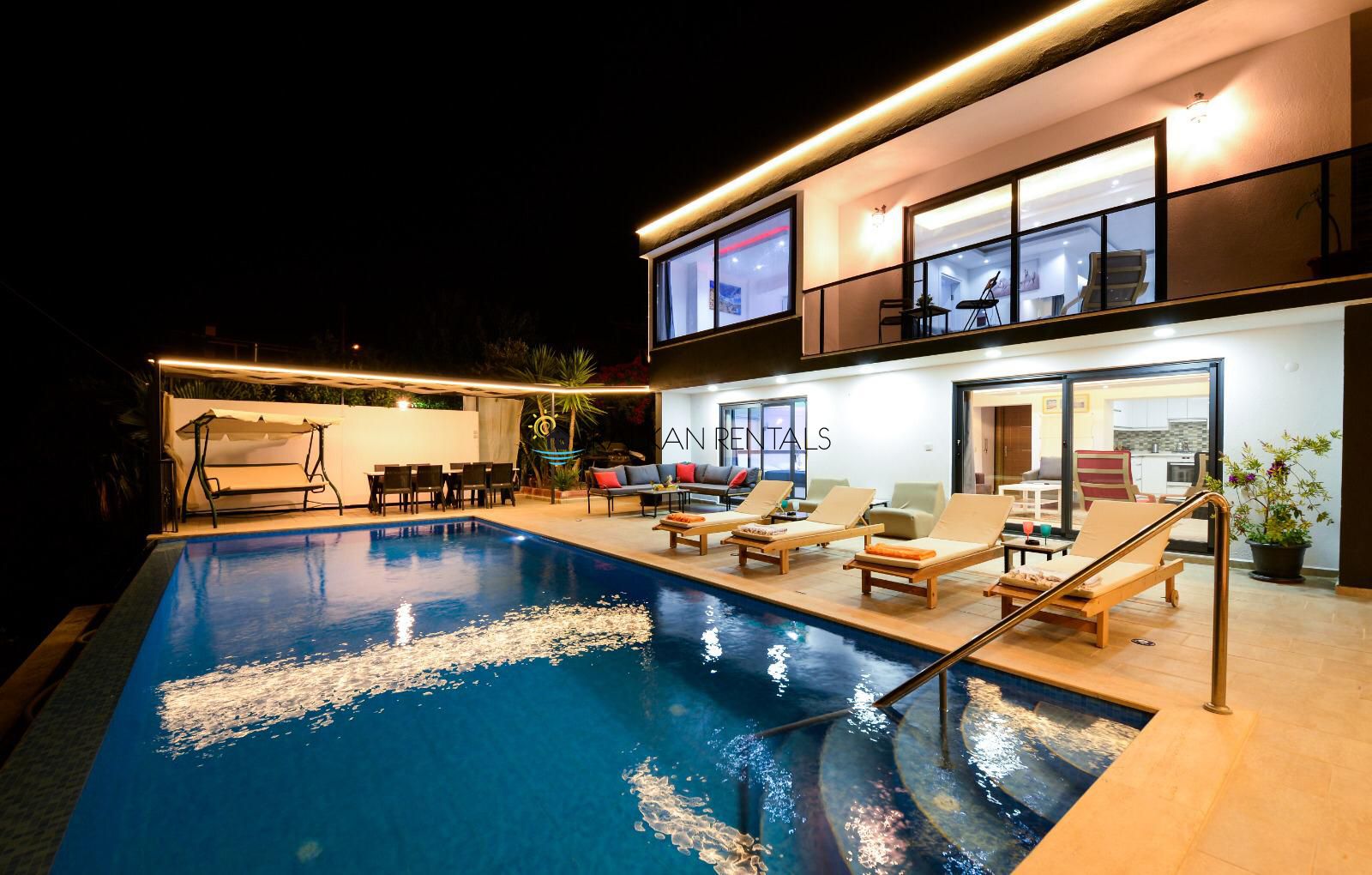 It is a rental holiday villa located in a quiet and peaceful location in the lush nature in Kalkan Islamlar region. Rental Villa Akdeniz 1 is a 1 bedroom villa with an accommodation capacity for 2 people in the category of honeymoon villas, conservative villas, villas with jacuzzis. It offers you a free holiday environment with its location that makes you feel nature, its clean air and its structure away from the eyes. Our building, where you can stay alone with nature, is decorated in a very modern way. There is a jacuzzi and a cinema room in our villa where you can have a pleasant time. The pool and garden were built in such a way that they cannot be seen from the outside. It is an ideal option for our guests and honeymooners who value privacy.
